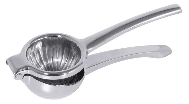 Orangensaftpresse, aus verchromtem Zinkguss, hochglänzend, mit herausnehmbarem Einsatz aus Edelstahl 18/10, mit rückfederndem Hebel