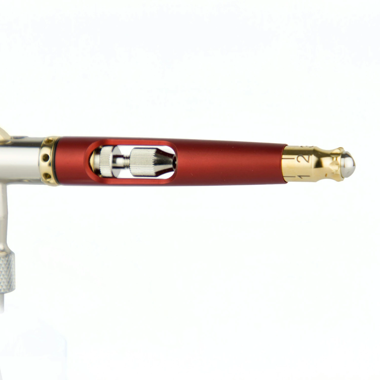 Besonders bemerkenswert sind die vielen Zusatzfeatures. Neben der bereits beschriebenen Zweitdüse und den beiden Düsenkappen, besitzt die Airbrushpistole auch eine Farbmengenvoreinstellung. Mit dieser Funktion kann man die sprühbare Farbmenge vor dem Sprühen begrenzen. Das Ganze wird als Quick-fix bezeichnet und ist technisch betrachtet eine Begrenzung des Nadelweges.