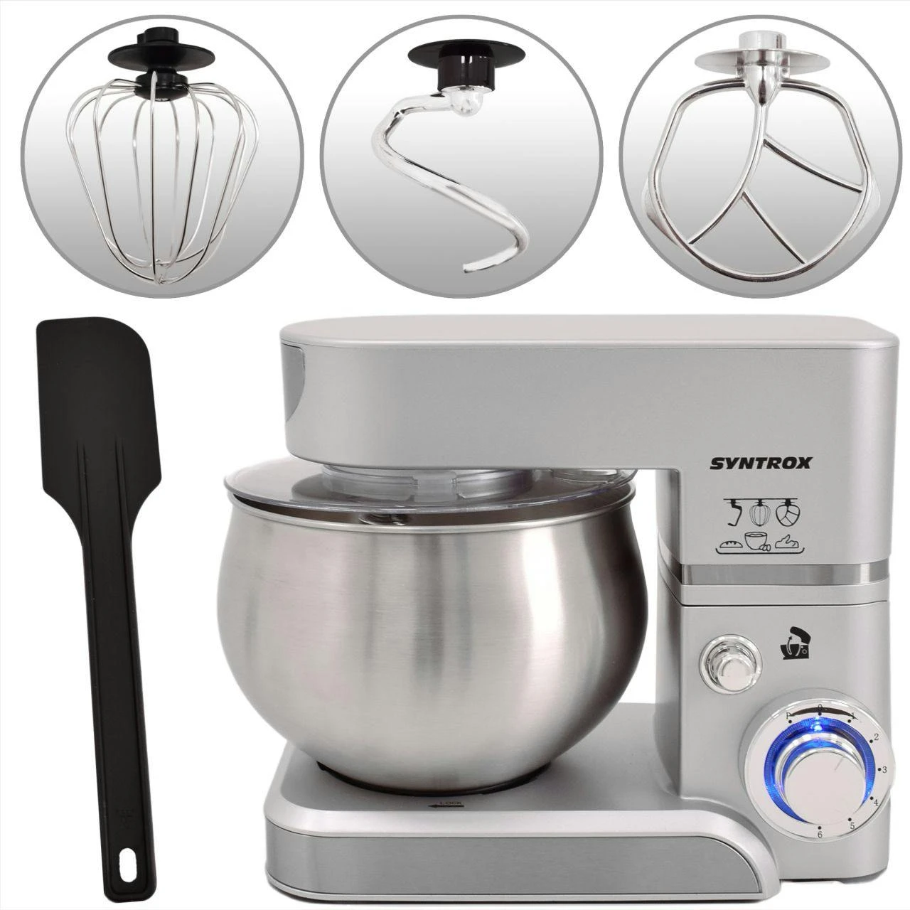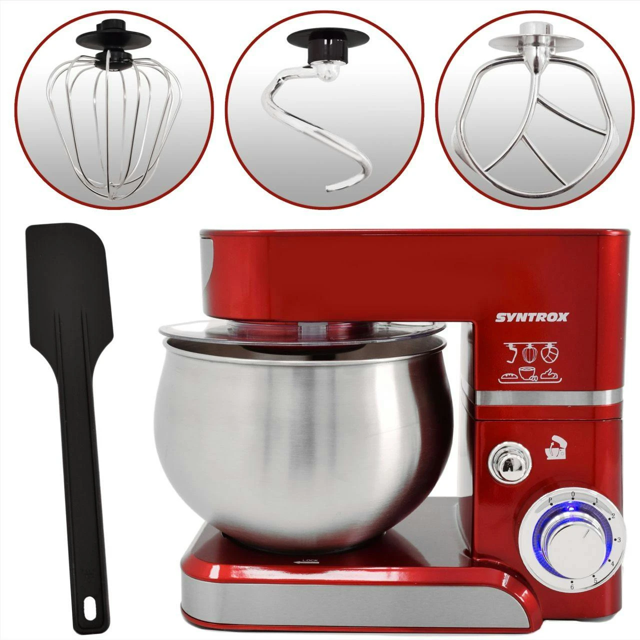 Syntrox Germany Küchenmaschine in verschiedenen Farben mit 5 Liter Edelstahlbehälter – hochwertiges DesignLust auf eine praktische und moderne Küchenmaschine, die Ihnen viele Vorteile bringt und für ein Plus an Komfort in der Küche beiträgt? Dann sind Sie hier im Shop von Syntrox Germany genau richtig. Sie bekommen hier eine große Vielfalt an Produkten für die Küche zu guten Konditionen. Die hier angebotene Syntrox Germany Küchenmaschine ist mit einem 5 Liter Edelstahl-Behälter ausgestattet und überrascht mit dem schicken, modernen Design und den vielen Extras. Mit der Syntrox Germany Küchenmaschine und Knetmaschine mit dem 5 Liter Edelstahl-Behälter erhalten Sie eine hochwertige und spezielle Maschine, mit der sich viele Arbeiten in der Küche wesentlich einfacher gestalten. Bestellen Sie sich die Syntrox Germany Küchenmaschine und Sie werden einen sehr guten Küchenhelfer zur Verfügung haben.Besonderheiten der Küchenmaschine Das Gerät ist mit 1.000 Watt leistungsstark und überzeugt mit einem guten Ergebnis. Verwenden Sie die Syntrox Küchenmaschine, um Brotteig, Kuchenteig oder Pizzateig vorzubereiten. Dank verschiedener Aufsätze ist mit der Küchenmaschine von Syntrox Germany jede Menge möglich. Zu den Aufsätzen der praktischen Küchenmaschine aus dem Hause Syntrox Germany gehören: • Knethaken • Rührhaken • SchneebesenDie 5 Liter Rührschüssel aus Edelstahl besteht aus rostfreiem Material. Sie können also problemlos immer und immer wieder Kuchenteige und andere Teige in der Schüssel zubereiten. Fast wie von alleine wird aus den Zutaten Teig gemacht. Geben Sie einfach die entsprechenden Zutaten in Ihre Rührschüssel, verwenden Sie das passende Rührwerkzeug und stellen Sie noch die Geschwindigkeit nach Wunsch ein. Für ein Plus an Stabilität sorgen die rutschfesten Gummifüße der Küchenmaschine. Eiweiß können Sie übrigens auch sehr gut schlagen. Dafür verwenden Sie einfach den Schneebesen und bringen ihn in Aktion. Doch nicht nur die Funktionen überzeugen. Ebenfalls interessant ist das schicke und moderne Design des Gerätes. In jeder Küche integriert sich die Maschine optimal. Die Küchenmaschine lässt sich auch sehr einfach reinigen. Über die praktische Küchenmaschine in der Küche werden Sie sich bestimmt freuen und viele Teige vorbereiten.Eigenschaften: • Power: 1000 Watt • Kabellänge: 1,1 m • Gewicht: 4,5 kg • Geschwindigkeiten: 6 • Rutschfeste Gummifüße für Stabilität • einfache Reinigung • Farbwahl: schwarz, rot, silber