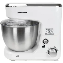 Syntrox Germany Küchenmaschine mit 5 Liter Edelstahl-Behälter in Creme – hochwertig und speziellLust auf eine praktische und moderne Küchenmaschine, die Ihnen viele Vorteile bringt und für ein Plus an Komfort in der Küche beiträgt? Dann sind Sie hier genau richtig. Sie bekommen hier eine große Vielfalt an Produkten für die Küche zu guten Konditionen. Die hier angebotene Syntrox Germany Küchenmaschine ist mit einem 5 Liter Edelstahl-Behälter ausgestattet und überrascht mit dem schicken, modernen Design und den vielen Extras. Mit der Syntrox Germany Küchenmaschine und Knetmaschine mit dem 5 Liter Edelstahl-Behälter erhalten Sie eine hochwertige und spezielle Maschine, mit der sich viele Arbeiten in der Küche wesentlich einfacher gestalten.Besonderheiten der Küchenmaschine Das Gerät ist mit 1.000 Watt leistungsstark und überzeugt mit einem guten Ergebnis. Verwenden Sie die Syntrox Küchenmaschine, um Brotteig, Kuchenteig oder Pizzateig vorzubereiten. Dank verschiedener Aufsätze ist mit der Küchenmaschine von Syntrox Germany jede Menge möglich. Zu den Aufsätzen der praktischen Küchenmaschine aus dem Hause Syntrox Germany gehören: • Knethaken • Rührhaken • SchneebesenDie 5 Liter Rührschüssel aus Edelstahl besteht aus rostfreiem Material. Sie können also problemlos immer und immer wieder Kuchenteige und andere Teige in der Schüssel zubereiten. Fast wie von alleine wird aus den Zutaten Teig gemacht. Geben Sie einfach die entsprechenden Zutaten in Ihre Rührschüssel, verwenden Sie das passende Rührwerkzeug und stellen Sie noch die Geschwindigkeit nach Wunsch ein. Für ein Plus an Stabilität sorgen die rutschfesten Gummifüße der Küchenmaschine. Eiweiß können Sie übrigens auch sehr gut schlagen. Dafür verwenden Sie einfach den Schneebesen und bringen ihn in Aktion. Doch nicht nur die Funktionen überzeugen. Ebenfalls interessant ist das schicke und moderne Design des Gerätes. In jeder Küche integriert sich die Maschine optimal. Die Küchenmaschine lässt sich auch sehr einfach reinigen. Über die praktische Küchenmaschine in der Küche werden Sie sich bestimmt freuen und viele Teige vorbereiten. Eigenschaften: • Power: 1000 Watt • Kabellänge: 1,1 m • Gewicht: 4,5 kg • Geschwindigkeiten: 3 (Max, Middle, Small) • Rutschfeste Gummifüße für Stabilität • einfache Reinigung • Farbwahl: creme