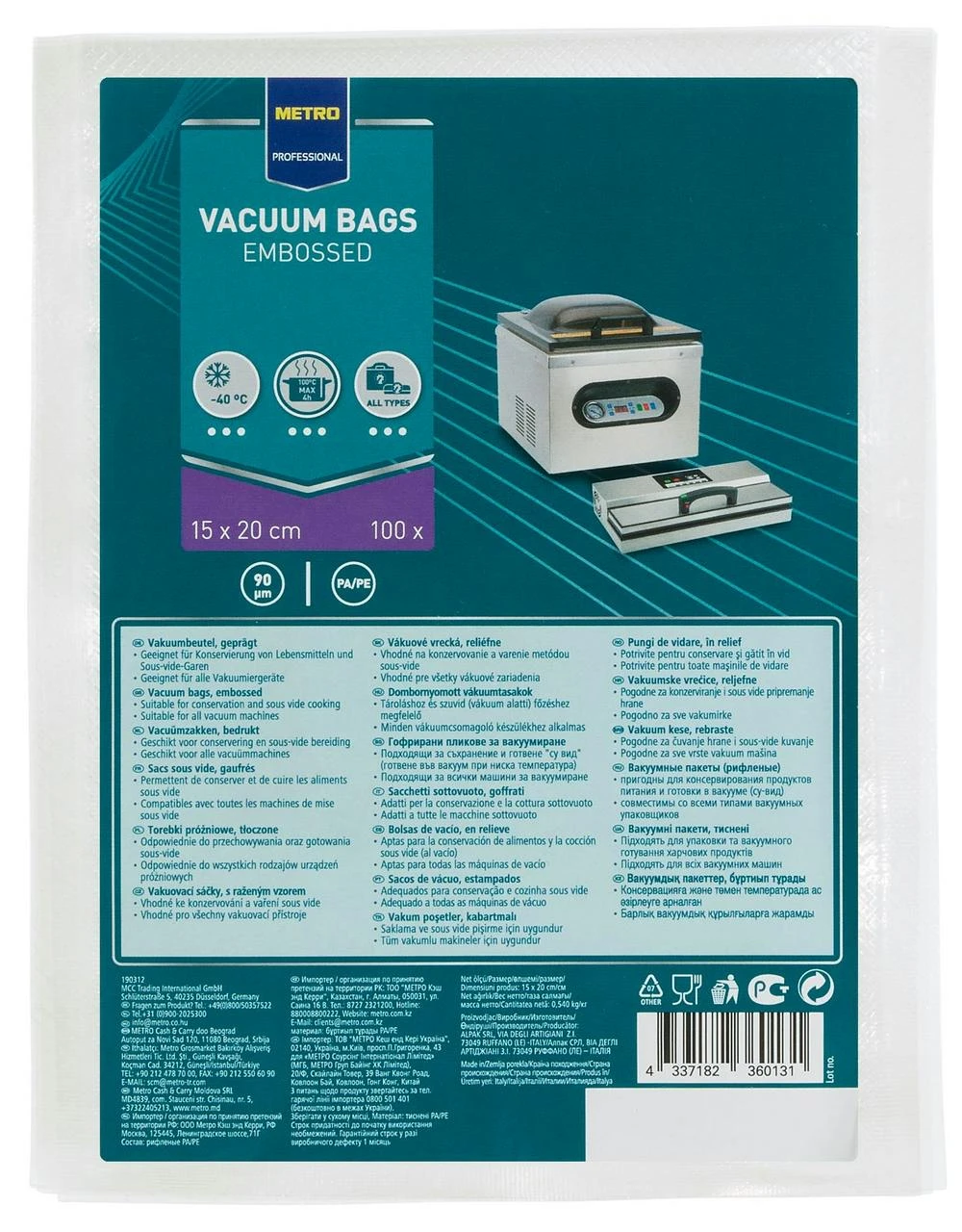 Das Produkt enthält 100 Stück Vakuumbeutel, bestehend aus einer geprägten und einer glatten Seite mit den Maßen 15 x 20 cm (B x L) und einer Dicke von 100 mm auf der geprägten Seite und 90 mm auf der glatten Seite. Die Beutel können Temperaturen von bis zu 100°C für maximal 4 Stunden halten und sind für Schockfrost (-40°C) geeignet.