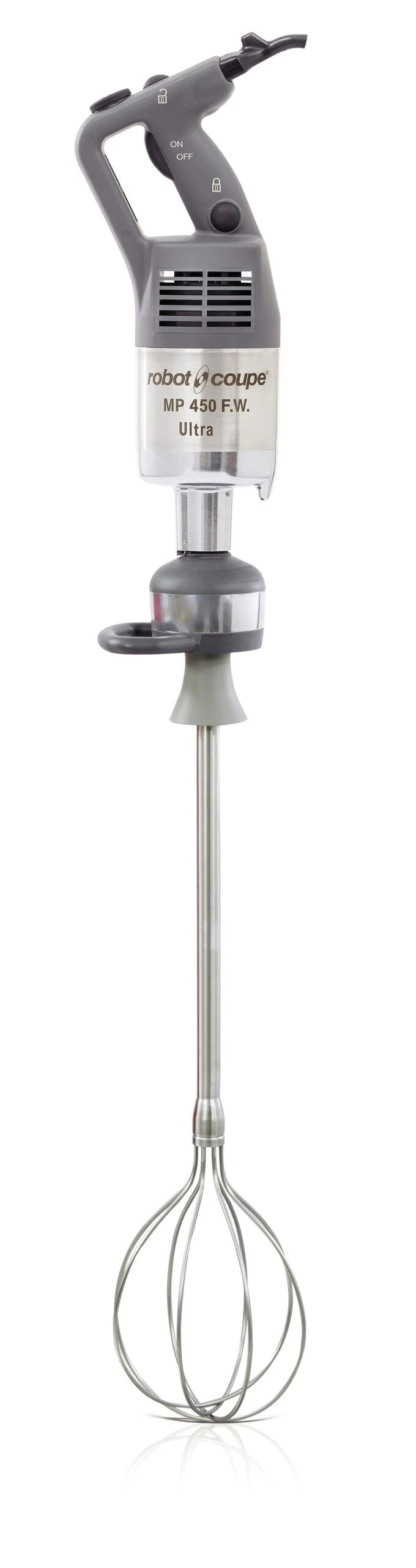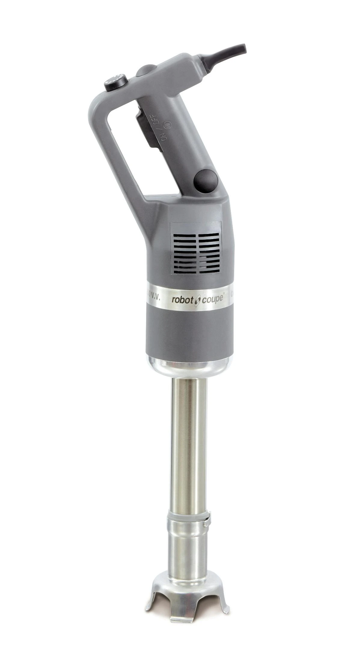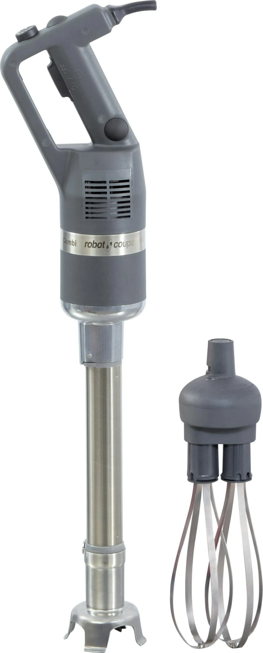 „Stabmixer CMP 250 Combi. Einphasig 230/50/1. Leistung 310 Watt. Stufenlose Drehzahlregelung von 2300 bis 9600 U/min als Mixer und von 500 bis 1800 U/min als Rührbesen. Messer, Mischkopf und Stab ganz aus
