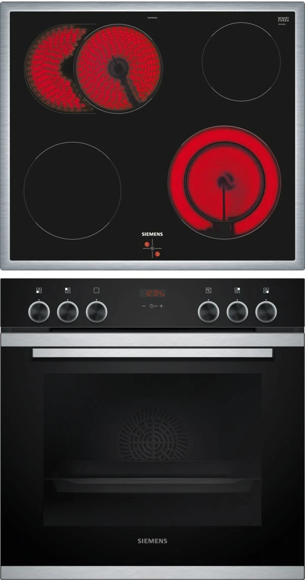 Siemens HE213ABS0 + EA64RGNA1E. Kochfeldtyp: Keramik, Anzahl Herdplatten/Kochzonen: 4 Zone(n), Art der Oberfläche: Glaskeramik. Ofentyp: Elektrischer Ofen, Netto-Ofenvolumen: 71 l, Ofenfarbe: Edelstahl/Schwarz