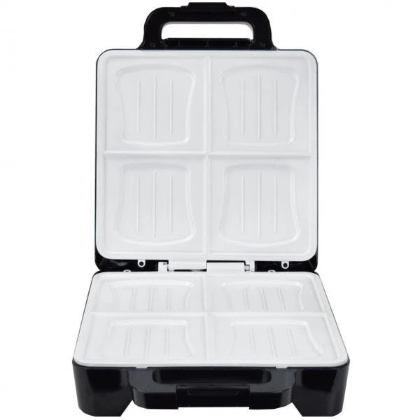 Sandwichmaker zum Backen von 4 leckeren Muschel-Sandwiches Der Maker besitzt 2 große antihaftbeschichtete Backplatten aus Keramik. Der obere Teil ist in Senkrechtstellung und in 100° Stellung aufklappbar. Er kann dadurch zur besseren Befüllung & Reinigung arretiert werden. Durch die aufrechte Aufstellmöglichkeit lässt sich das Gerät platzsparend im Schrank verstauen. • Verriegelungssystem • 4 rutschfeste standüße • einfache Handhabung und Reinigung • Betriebskontrollleuchte und Bereitschaftsanzeige • Farbe: schwarz mit Edelstahlabdeckung • Maße ca. ( L x B x H): 36 x 29 x 11 cm • Plattengröße: 28,7 x 28 cm • Kabellänge: 75 cm • 220 Volt • 1600 Watt max. Power